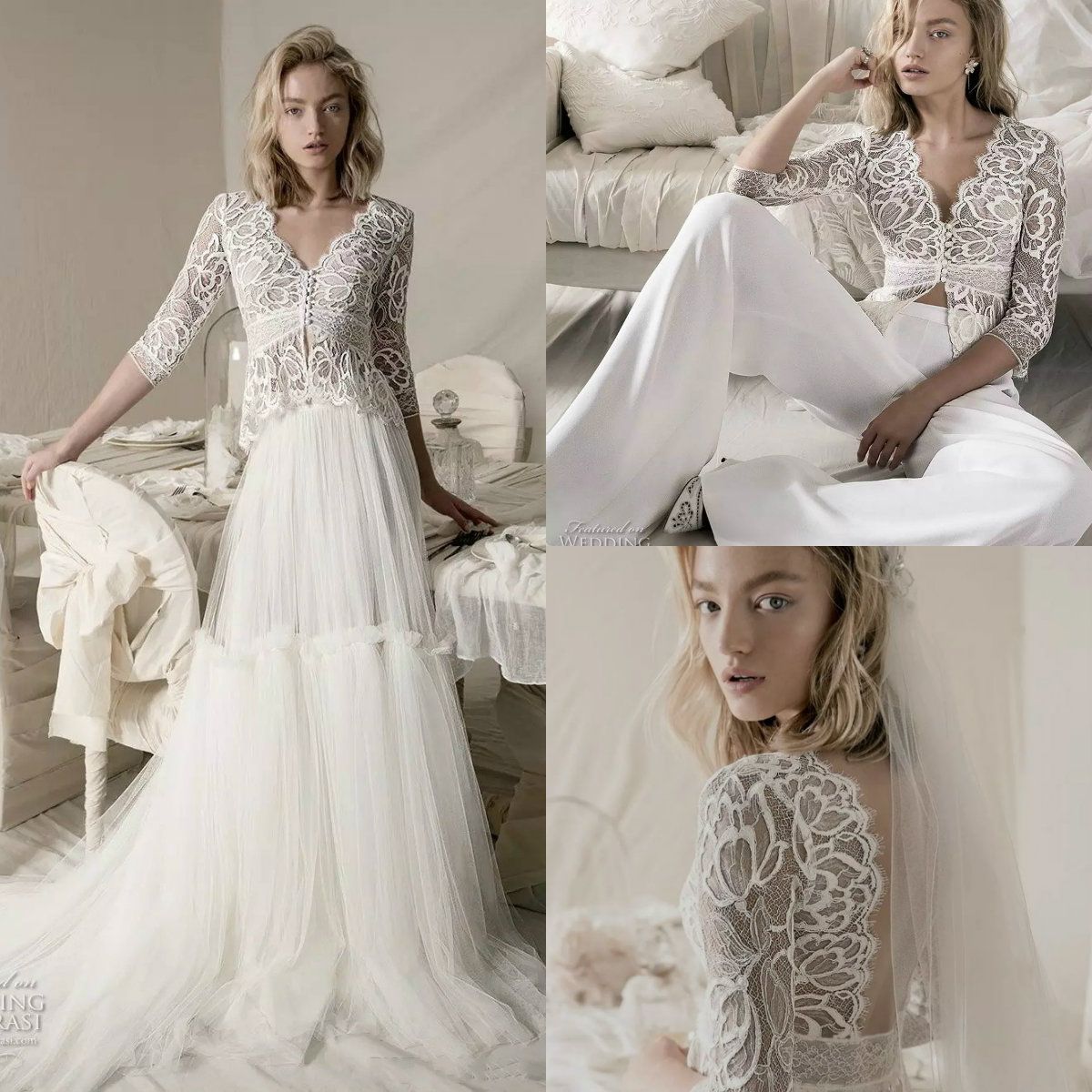 Discount Three Pieces Pants Wedding Dresses With Detachable Overskirts Lace Applique 3 4 Long Sleeve Wedding Dress Deep V Neck Illusion Bridal Gown