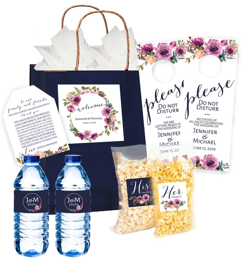 Wedding Hotel Guest Welcome Bag Set Navy Blue Floral Pink Magenta Burgundy Blush Watercolor Garden Door Hanger Water Bottle Label Itinerary