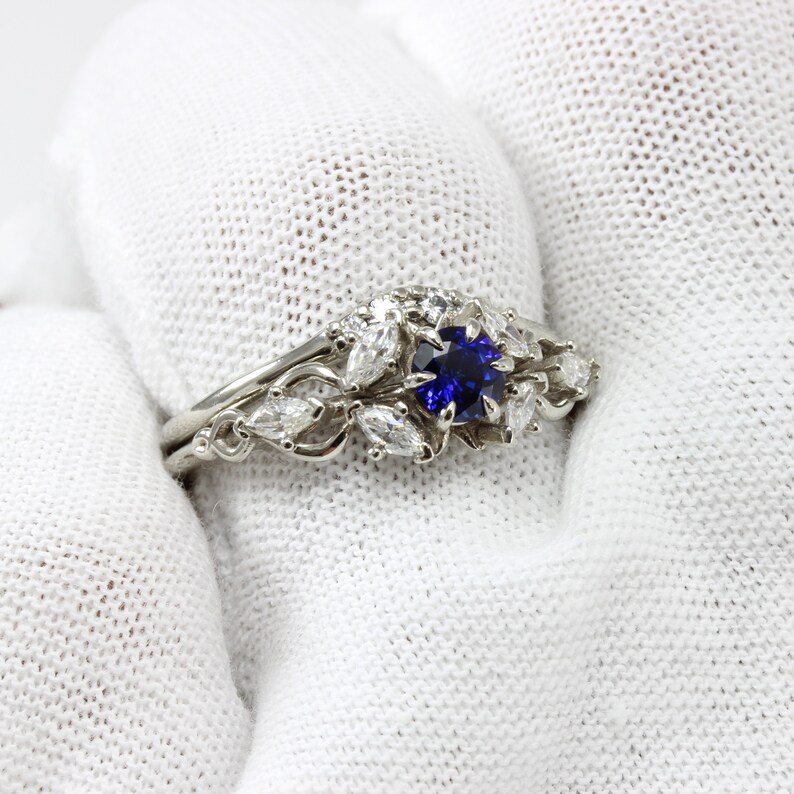 10k White Gold Elvish Engagement Ring Set With Lab Sapphire Size 7 10 Elven Fantasy Engagement Ring Nerdy Geek Engagement Ring