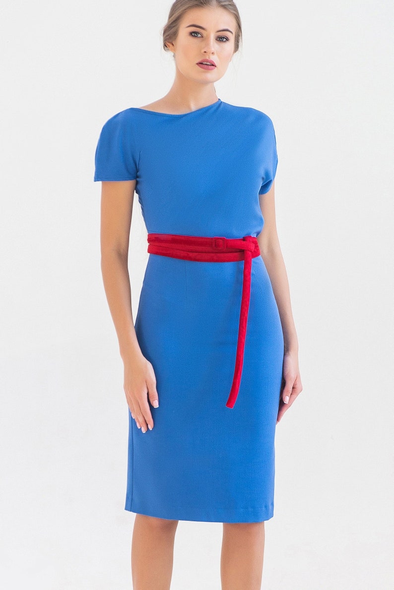 Blue Pencil Dresses For Women Midi Cocktail Wedding Guest Party Dress Summer Fitted Wiggle Dress Office Business Belted Dress Tavrovska