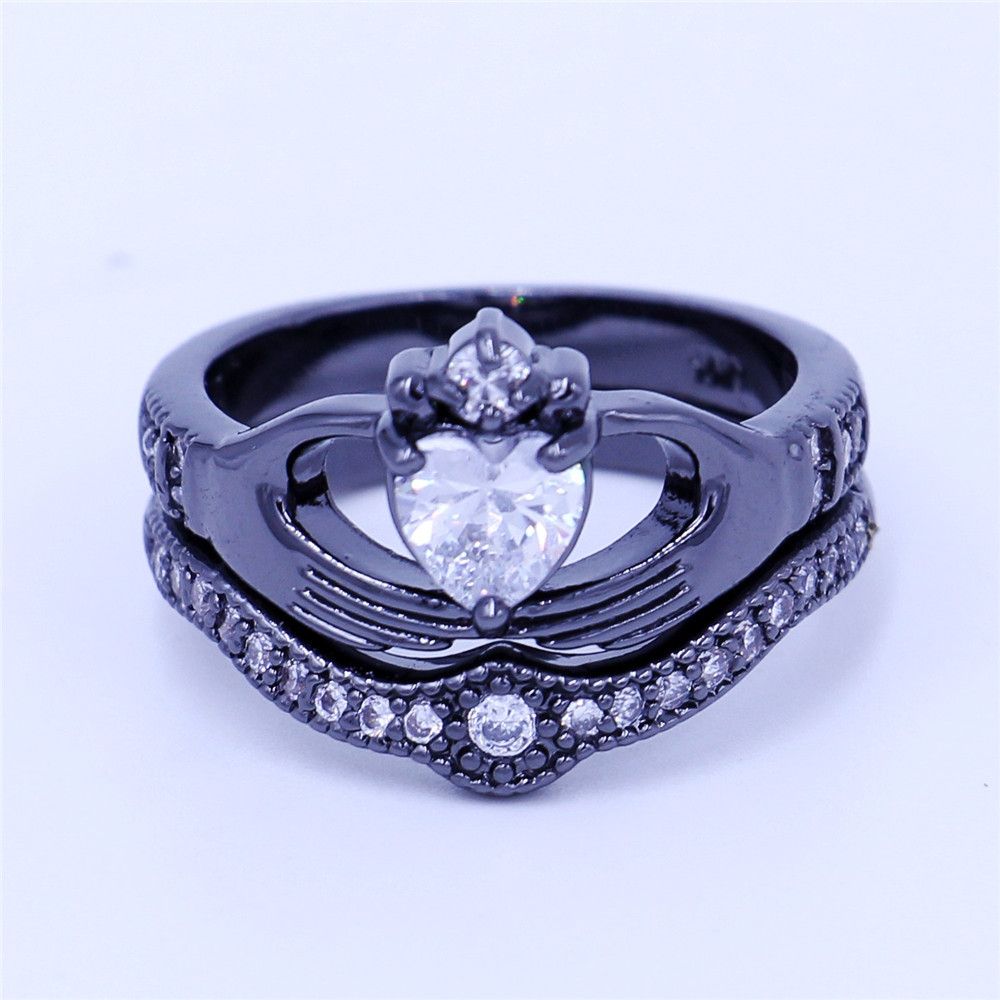 Fashion Claddagh Ring Jewelry Wedding Band Rings Set For Women 5a Zircon Cz Black Gold Filled Female Party Ring Birthday Gift