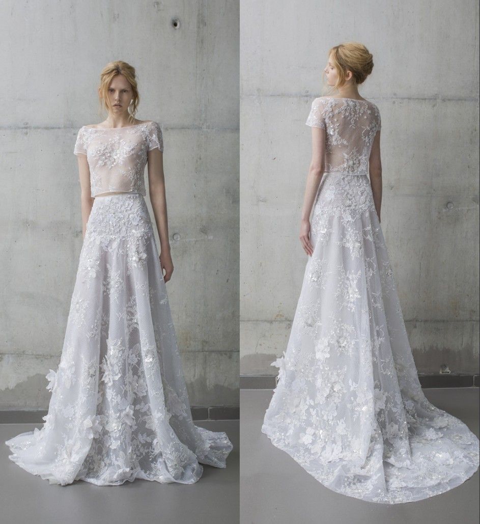 Stunning 2019 Beach Bohemian A Line Wedding Dresses Sheer Short Sleeve Lace Vintage Cheap 2 Piece Bridal Gowns