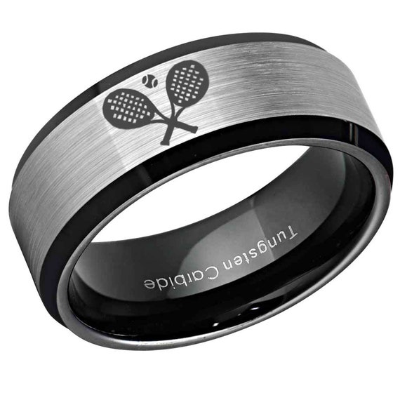 8mm Tennis Engraved Tungsten Ring Beveled Silver Brush Center Black Inside Tungsten Wedding Band Free Engraving Promise Ring For Him