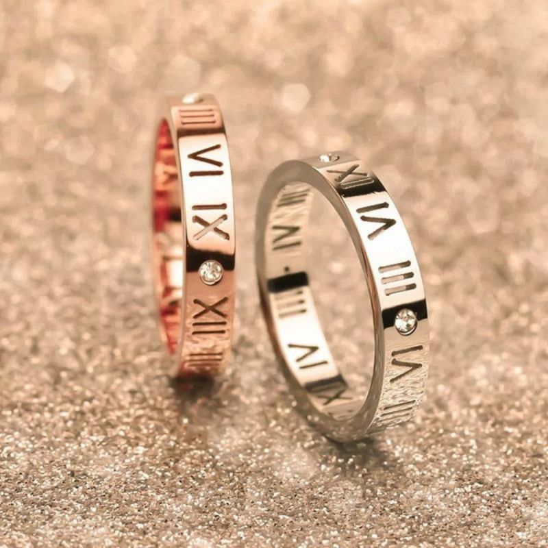 1pc Roman Numeral Hollow Out Stainless Steel Cz Crystal Women Wedding Ring Band 4mm Ladies Gold Silver Plated Jewelry