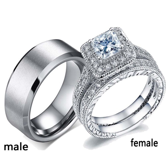 2 Rings Couple Rings 316l Stainless Steel Mens Wedding Band Cz Women S Ring Sets