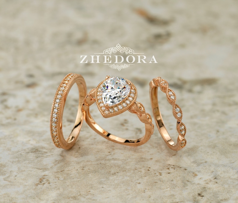 Pear Shape Engagement Ring Set Art Deco Channel Set Bands Rose Gold Plated Pear Cut Bridal Set Pear Shape Wedding Set Halo Pear Shape Ring
