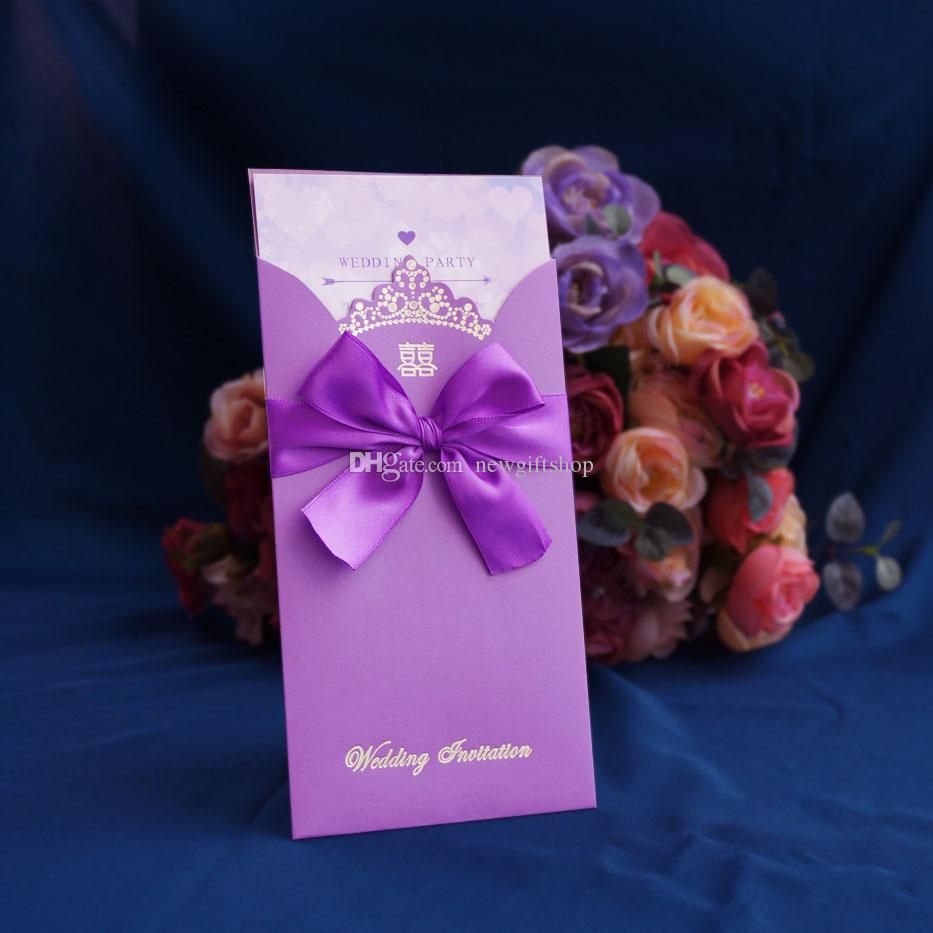 Chinese Xi Gold Crown Wedding Invitations With Bow Red Blue Champagne Purple Pink Color Free Printing Free Shipping