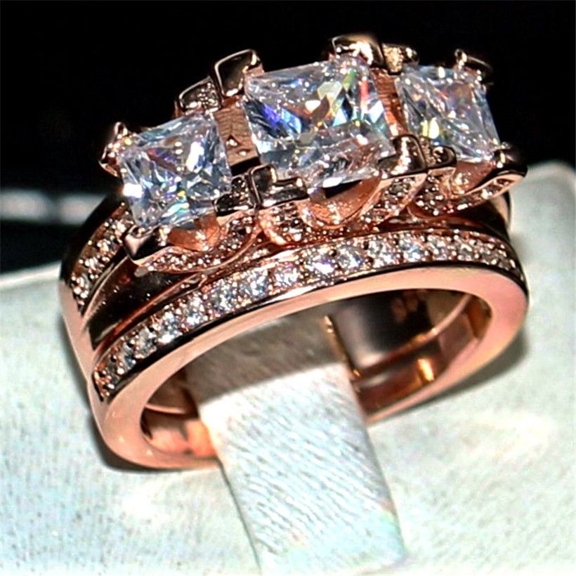 2019 Brand Gemstone Ring Finger Jewelry Three Stones White Diamond Rings Set 2 In 1 925 Silver Rose Gold Wedding Ring For Women From Fashion7house