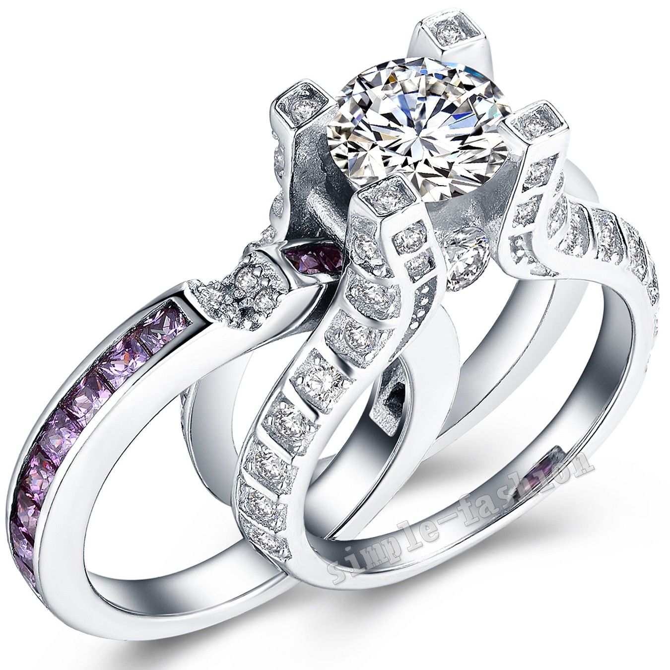 Xahh Women 2 Pcs 925 Sterling Silver Plated Princess Cut Purple Amethyst Diamond Cz Engagement Wedding Ring Set
