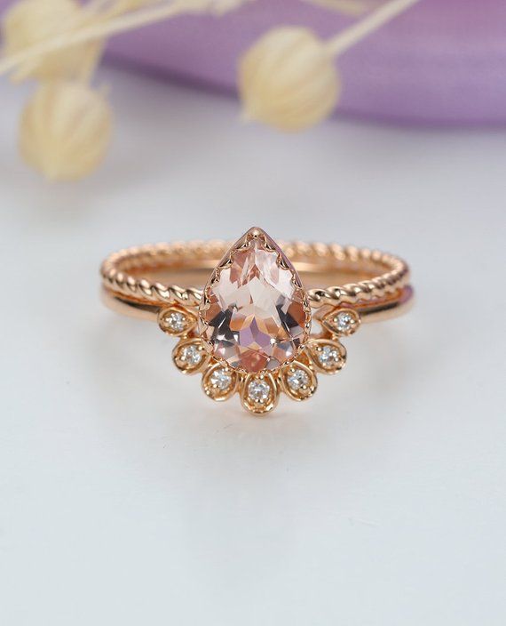 Pear Cut Ring Set Rose Gold Engagement Ring White Topaz Art Deco Stack